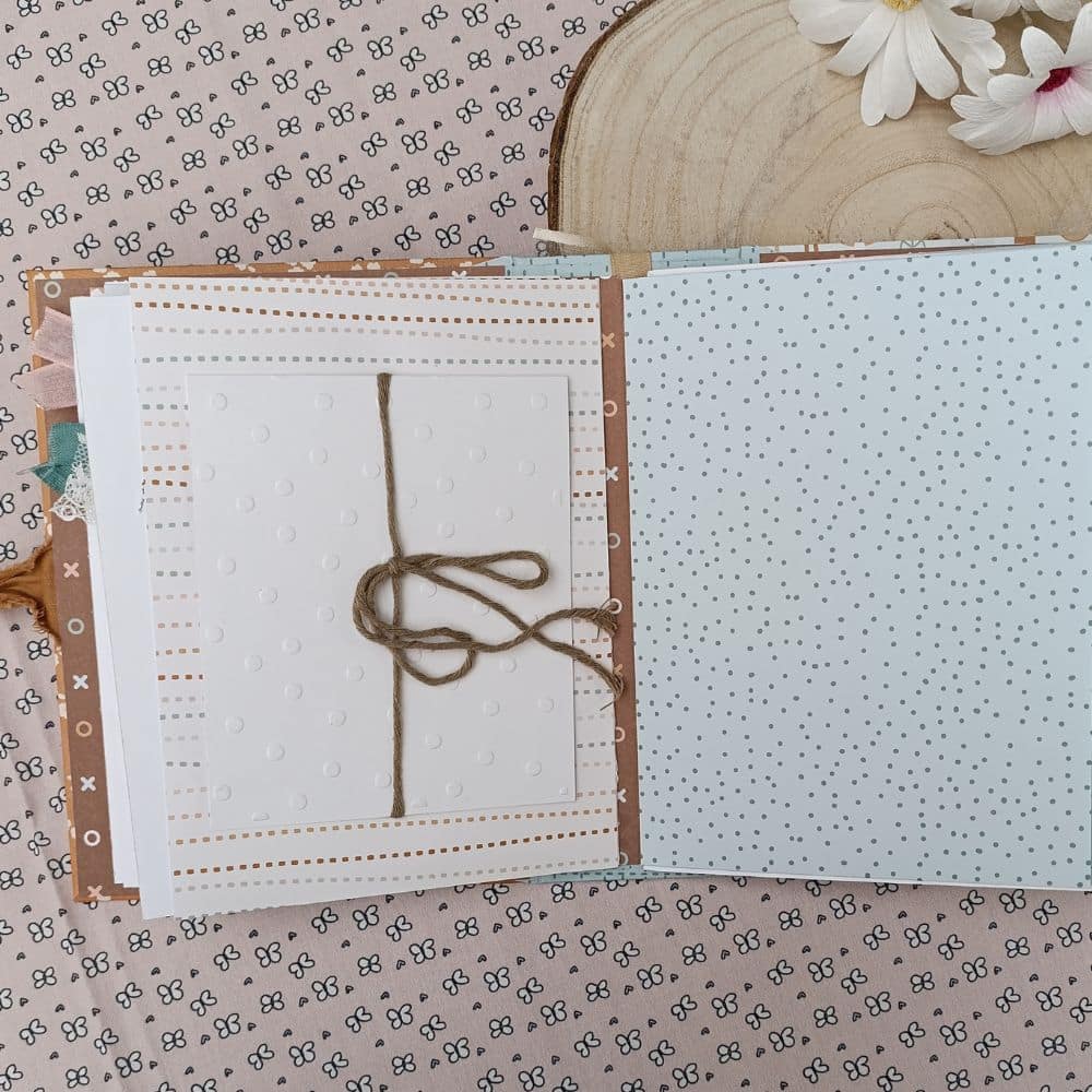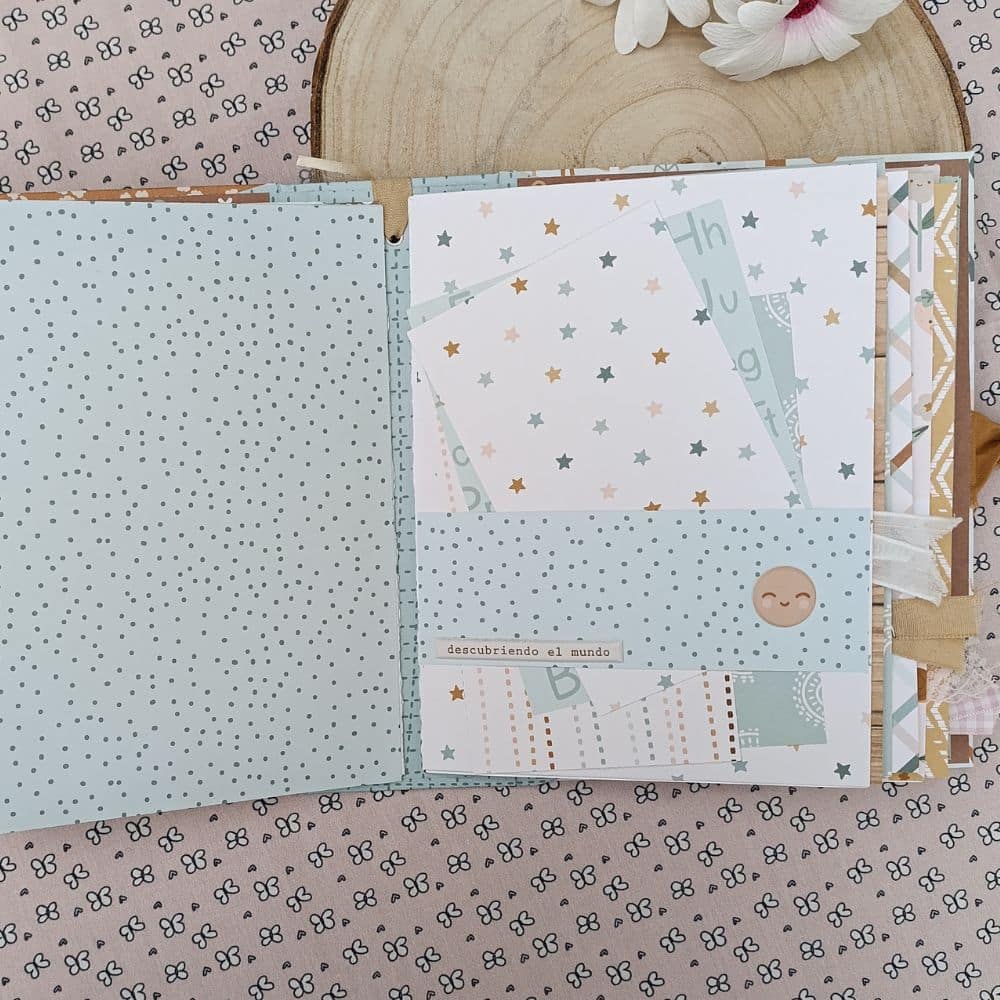 Este álbum tiene 8 páginas en su interior con bolsillos, desplegables y un cierre de lazo de algodón. Este álbum tiene mucho detalle tanto en el lomo como en su interior con muchas pegatinas, frases y papeles especiales de la misma colección.