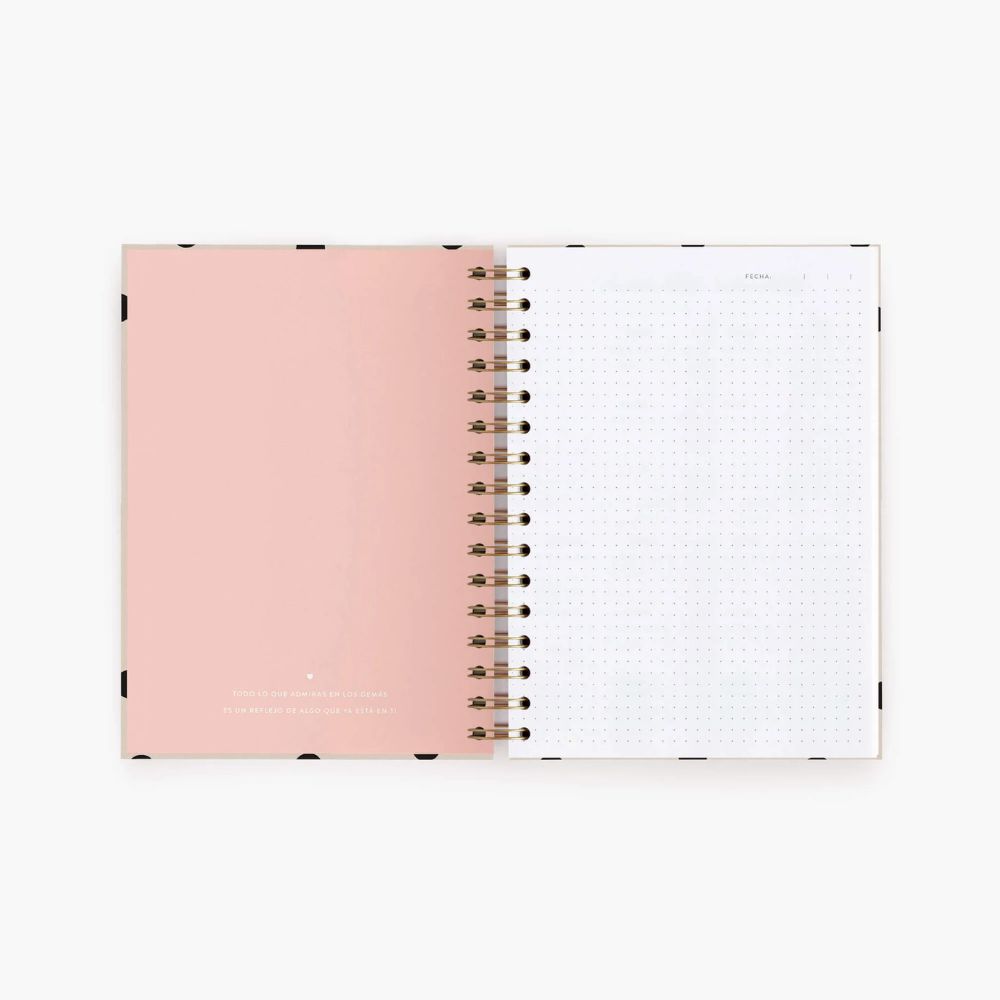 Cuaderno en tamaño A5. Pégale tickets, fotos y recuerdos y se convertirá en tu diario. El interior es de puntitos, la impresión es suave para que puedas utilizarlo para escribir o dibujar.