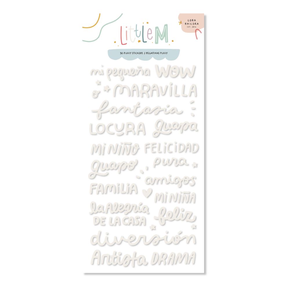 – Contenido: 30 pegatinas puffy con frases en diferentes letterings en color blanco.