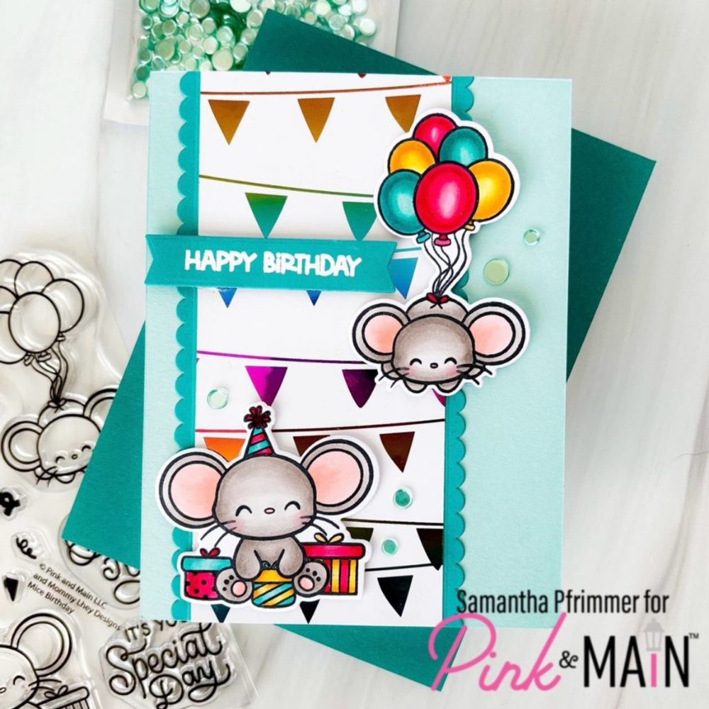 Este set de sellos de 4 x 6 pulgadas es perfecto para crear divertidas tarjetas de cumpleaños. ¡Estos ratones de cumpleaños están de fiesta!