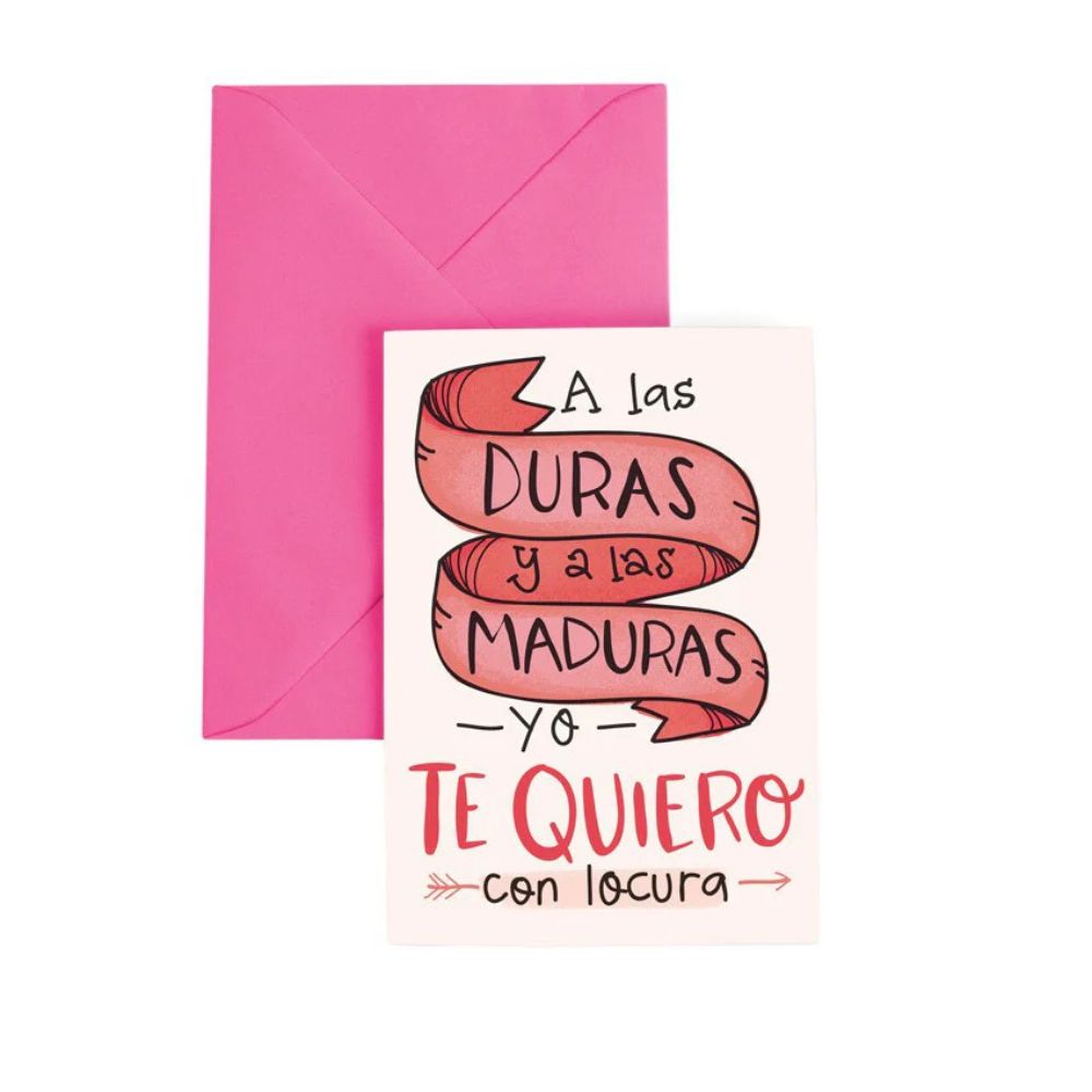 Tarjeta de felicitación con ilustración original de Pedrita Parker, impresa a todo color con la frase «a las duras y a las maduras yo te quiero con locura».